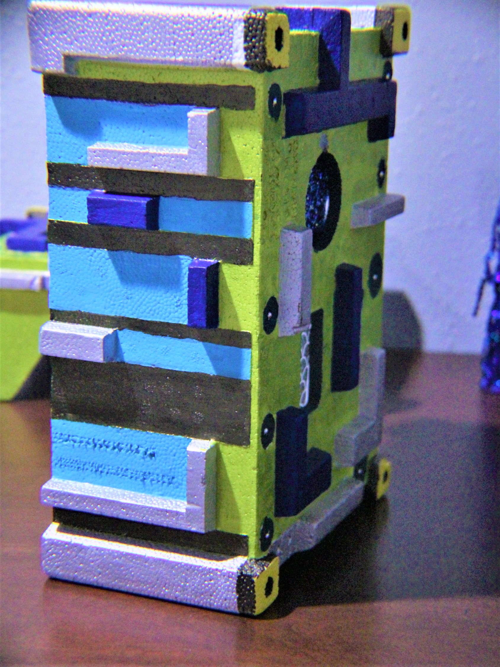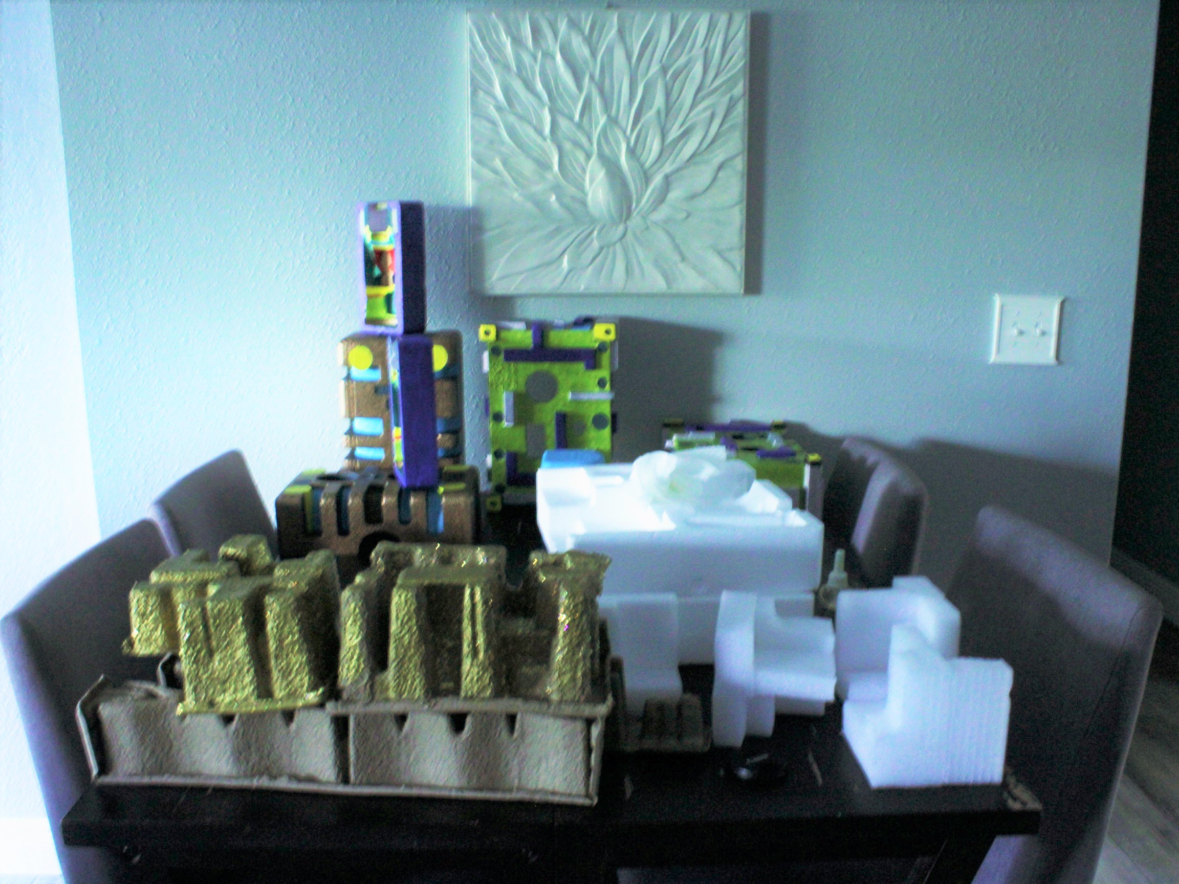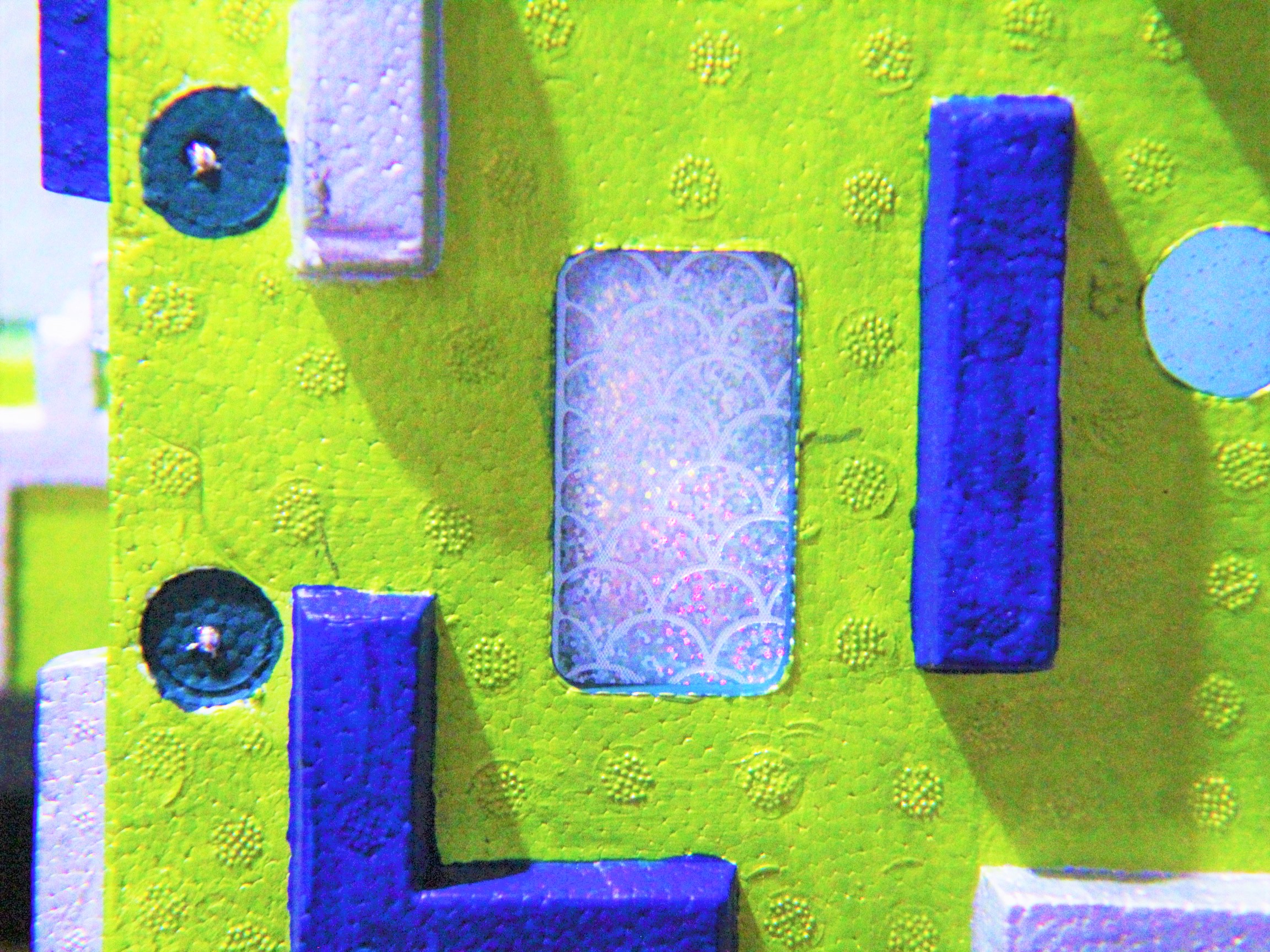 I enjoy making these stories out of as many “recyclable” materials as possible. Plastic and Styrofoam are some of my favorite materials to use, especially since they come in so many different shapes, sizes, forms, textures, sheers, and colors. Acrylics, polishes, and strategic embellishment can easily transform these materials into imaginative works of art. I find that the end results are as glamourous as I want them to be! 🌎